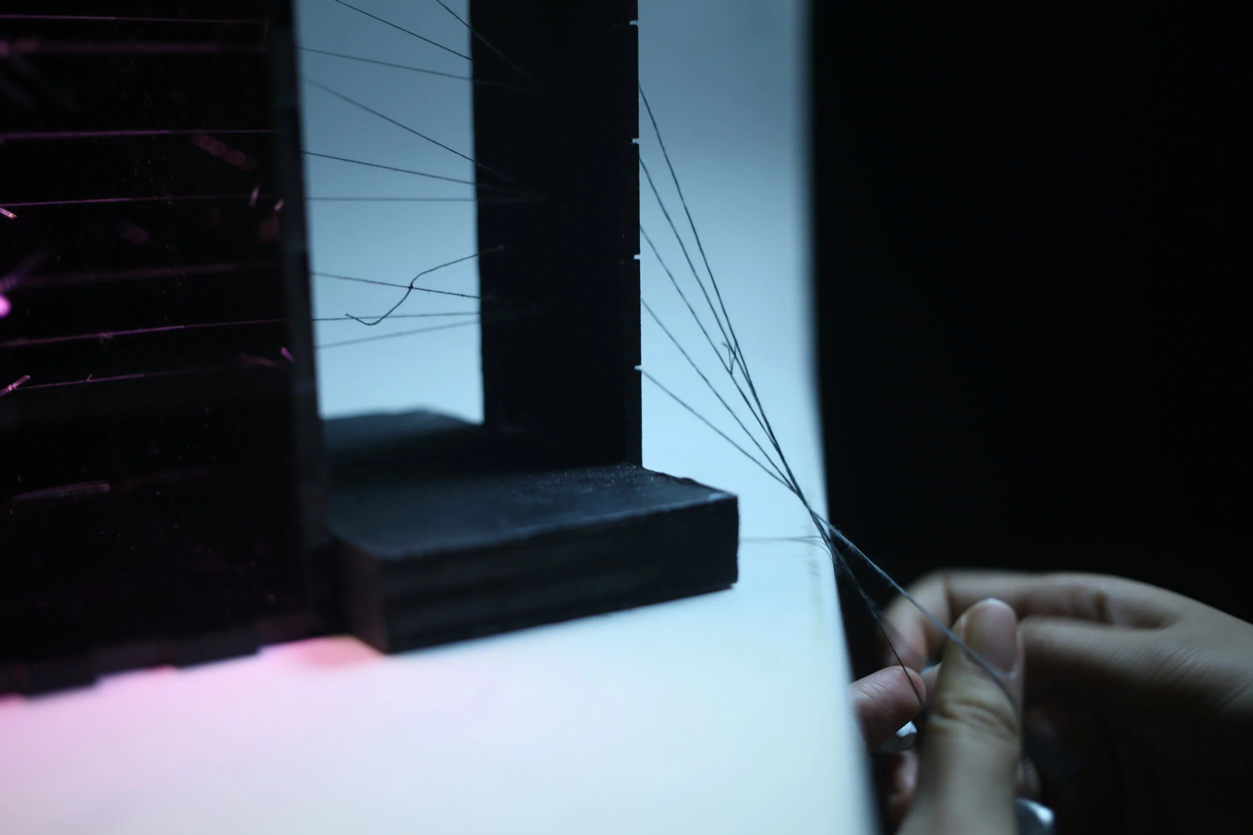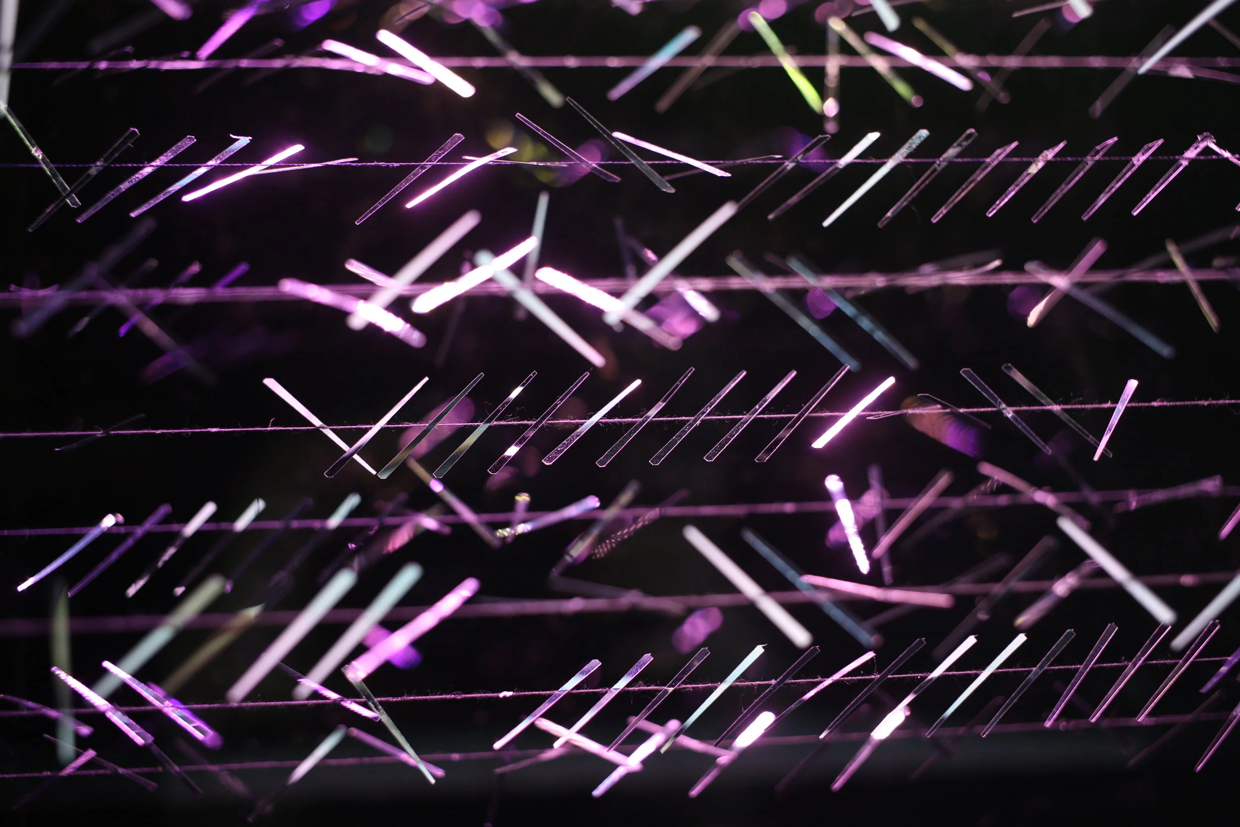 We accidentally discovered that mylar needles glue to a stretchy string can have very beautiful movements and surprising behavior. Especially when pulling the string, rotating the string, and blowing wind at it, the reflection of light as the mylar needles move makes very mesmerizing effects. We glue 30 mylar needles to each of the 15 strings together in perfect order and after some pulling and turning of the string, order shapes became random. The more you interact with it, the more random it becomes. In the end, many needles fell down from the string and create this feeling of the decay from order to entropy.