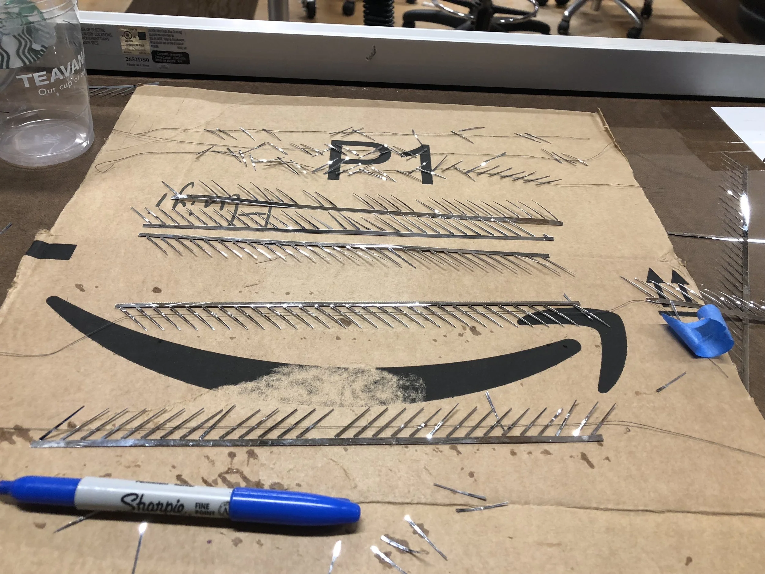To let the needles stay in place after cutting them from the big sheet of mylar, we print one skewer together by leaving a line connecting every needle. But the laser doesn’t do what we want.