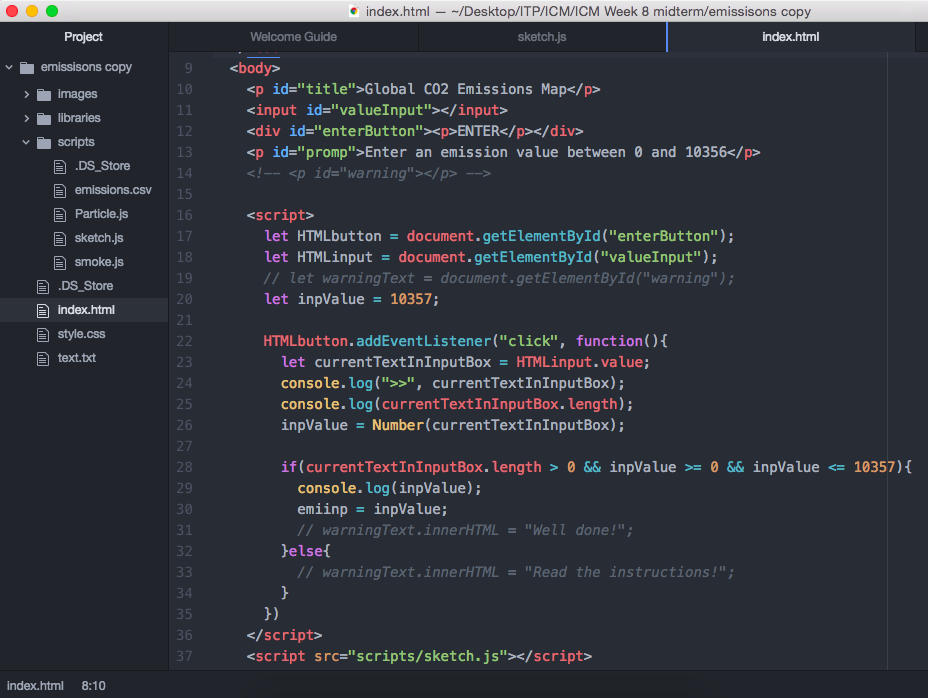 I spend many time figuring out the HTML and CSS elements because I am still not very familiar with them. Creating the input and button elements in HTML are very different from making them in P5. I am glad that I got the result I wanted and got to practice more coding languages that are not P5.